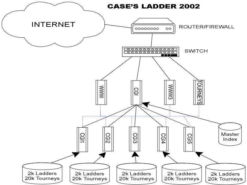 When the ladder first started over six long years ago, we had one server. Everything ran from this. Then we grew and the site started to slow down. So we added a second server (named CGI). When players posted a match result, it was done on the CGI server instead of the main site. This kept the pages loading fast and matches posting smoothly.