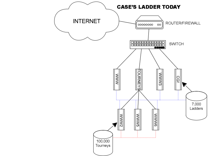Not much changed from the above layout for a long time. We added some extra servers to handle additional functions (such as moving Find Player to WWW3). The general approach was to install faster servers for CGI and WWW2 when things started to slow down. There is a limit to how often you can do this, and we recently ran into this.